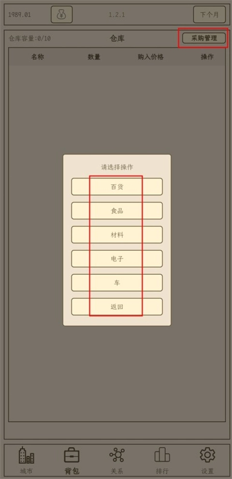 4.在背包中玩家可进行采购管理